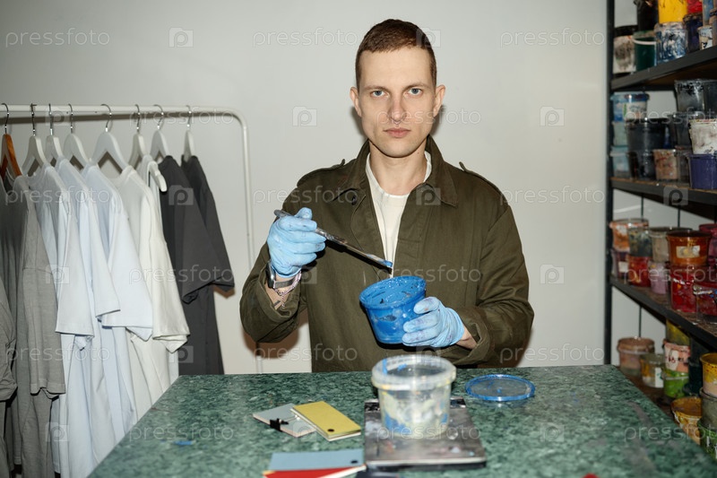Портрет молодого взрослого мужчины, смешивающего синюю краску в художественной студии