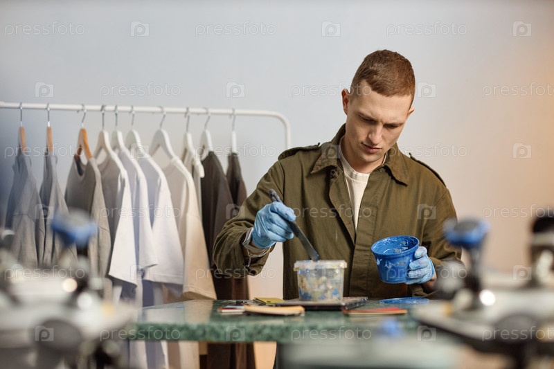 Молодой взрослый мужчина смешивает краску, работая в креативной студии