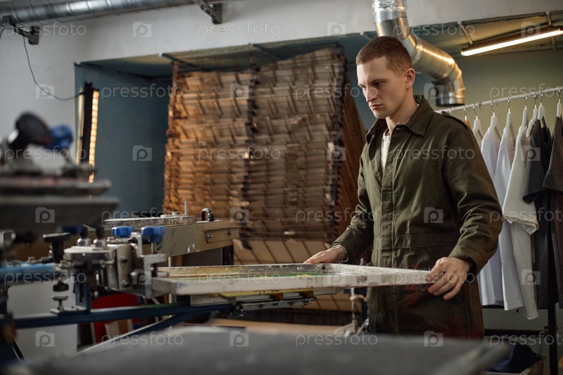 Молодой человек работает с печатным экраном в промышленной мастерской
