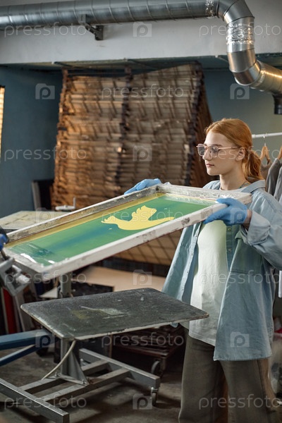 Вертикаль молодой взрослой женщины Экранная печать Художественное произведение в условиях мастерской