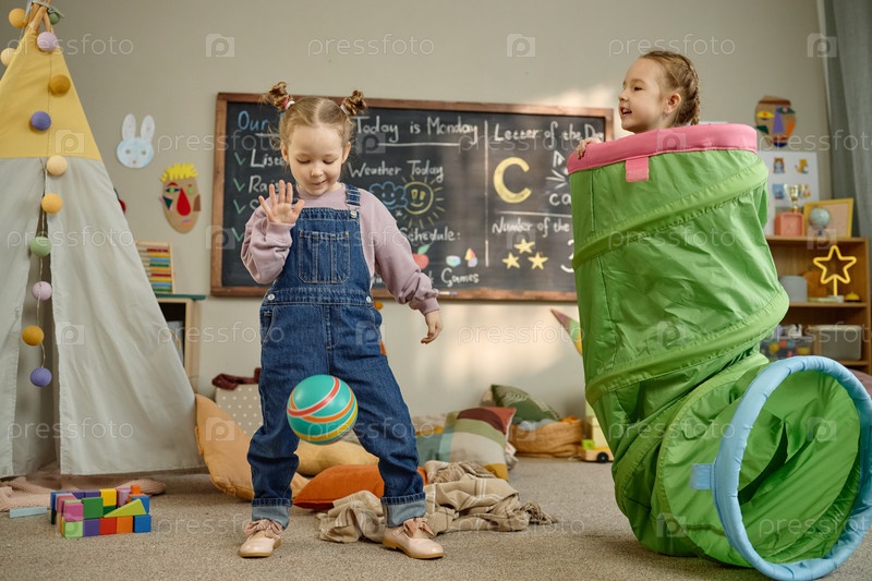 Две девочки играют с мячом и туннелем в классе детского сада