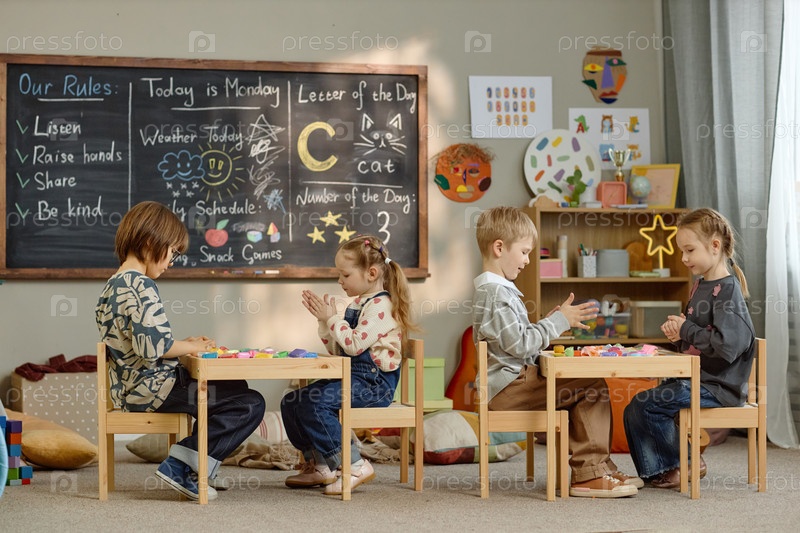 Группа детей, играющих с образовательными игрушками в классе детского сада