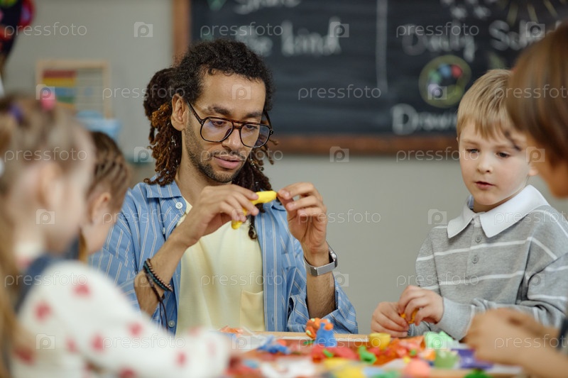 Молодой взрослый мужчина формирует глину, обучая детей искусству в детском саду