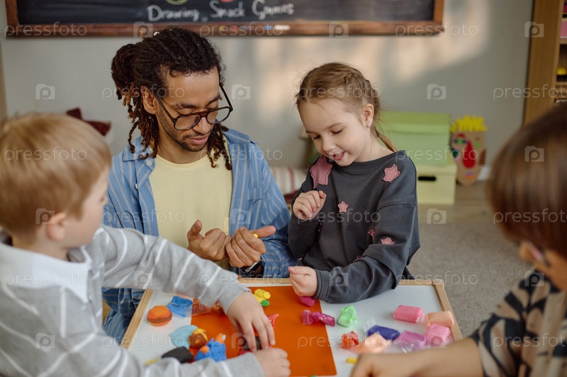 Девочка и многонациональные дети создают искусство с учителем-мужчиной в детском саду