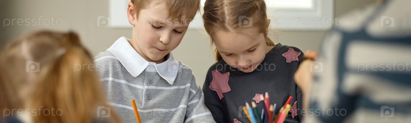 Заголовок Детей, рисующих вместе во время творческой деятельности в детском саду