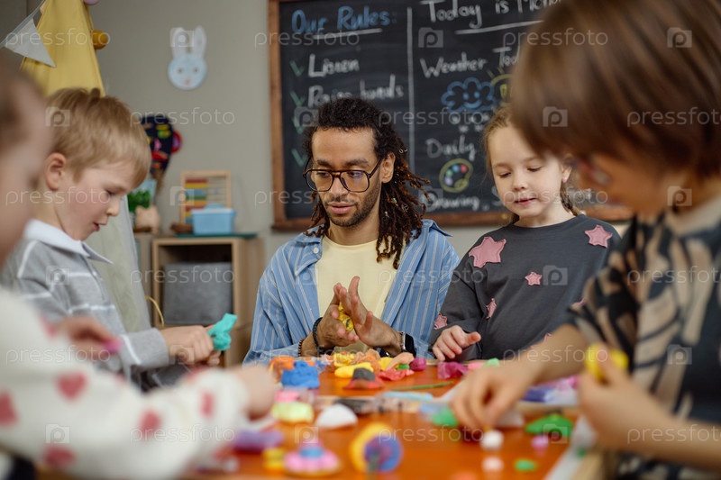 Мультиэтнический детский сад Дети и молодой взрослый мужчина создают искусство вместе