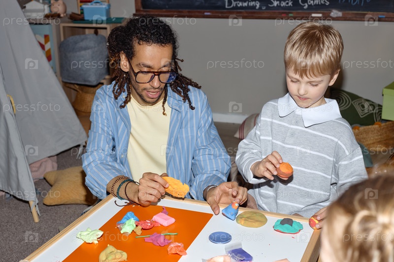Молодой мальчик и молодой взрослый чернокожий мужчина формируют глину в классе детского сада