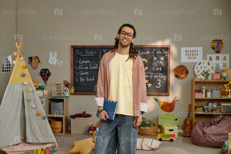 Портрет молодого взрослого мужчины, улыбающегося и стоящего в классе детского сада