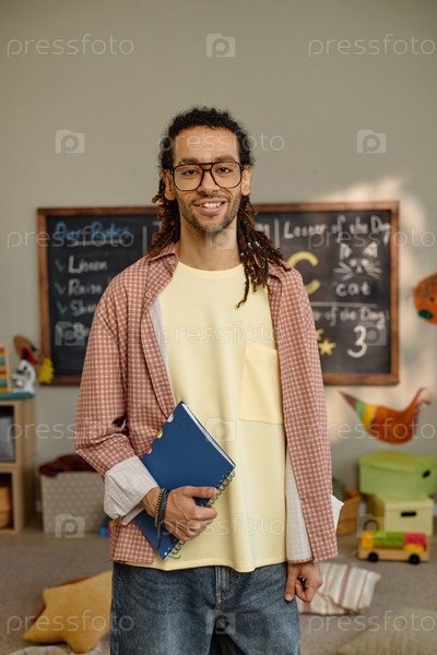Вертикальный портрет молодого взрослого учителя детского сада, улыбающегося в игровой комнате