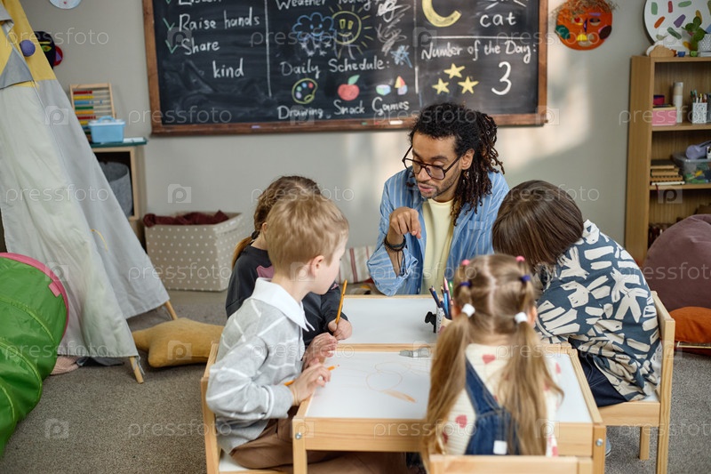 Многонациональные дети слушают молодого взрослого мужчину, преподающего на уроке рисования
