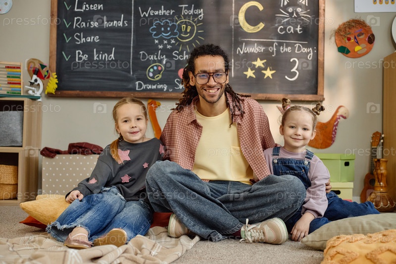 Девочки и молодой взрослый чернокожий мужчина улыбаются вместе в классе детского сада