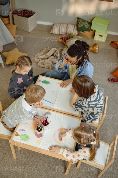 Вертикаль многоэтнического детского сада Дети рисуют с молодым взрослым мужчиной
