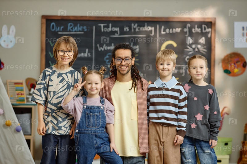 Портрет мужественного учителя с группой улыбающихся детей, позирующих вместе