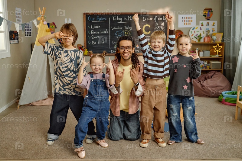 Мультиэтническая учительница детского сада и дети, позирующие и улыбающиеся в классе