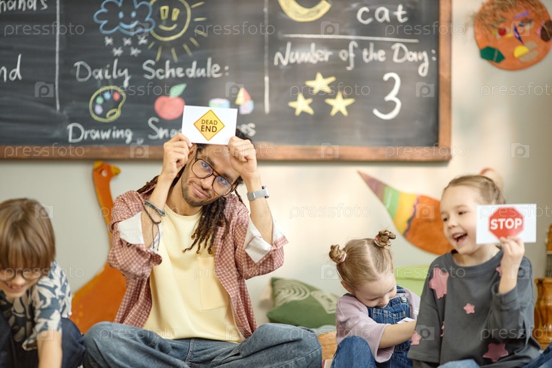 Учитель привлекает многонациональных детей к занятиям в классе Мужчина