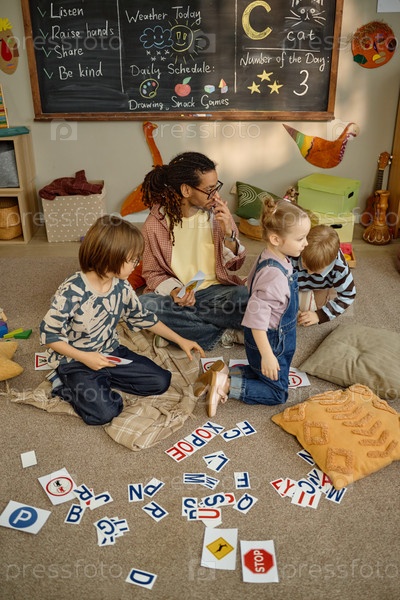 Вертикаль мужского учителя, курирующего детей, обучающихся дорожным знакам в помещении