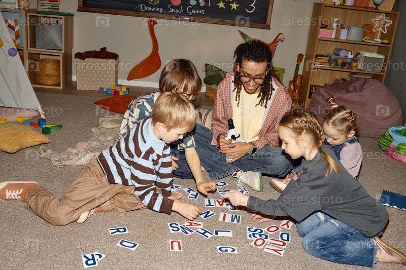 Мультиэтнический детский сад Учитель направляет детей, устраивая буквы алфавита