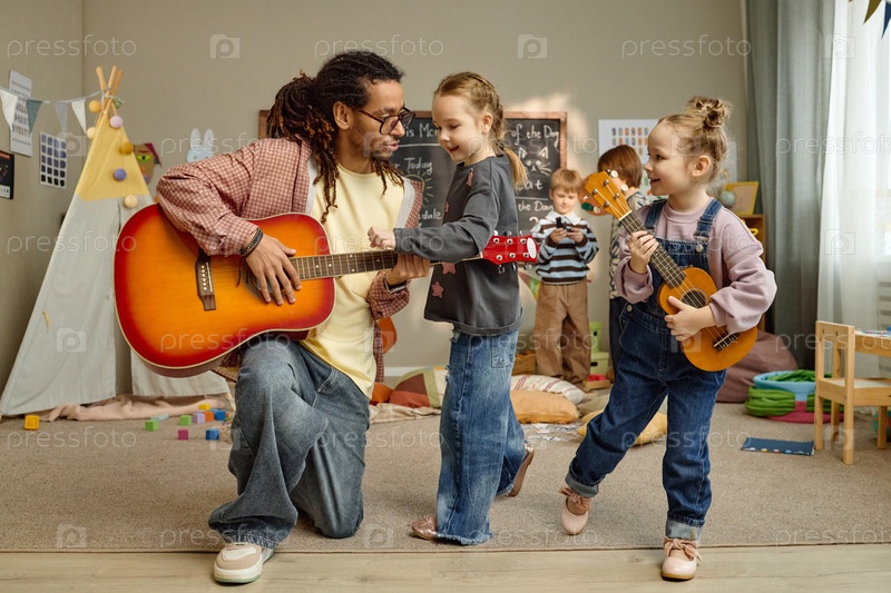 Девочки и чернокожие мужчины играют на гитаре вместе в классе детского сада