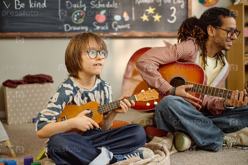 Мальчик играет на укулеле с черным мужчиной, который преподаёт гитару в детском саду