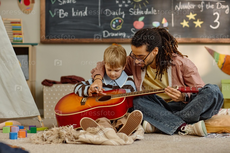Мальчик и чернокожий мужчина играют на гитаре вместе в классе детского сада