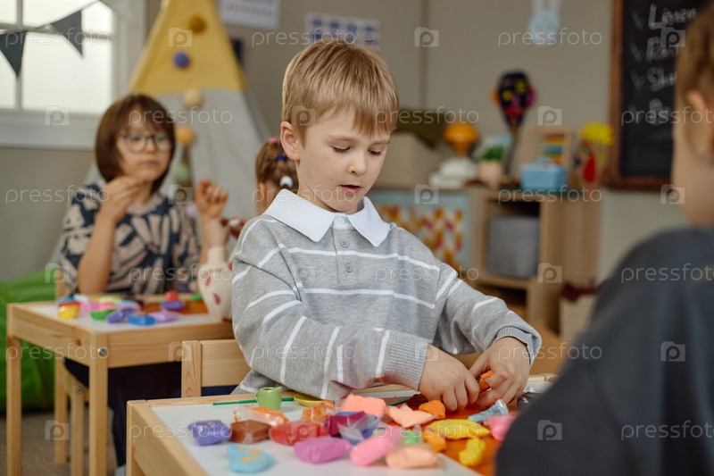 Мальчик, играющий с моделируемой глиной в детском саду Классная обстановка