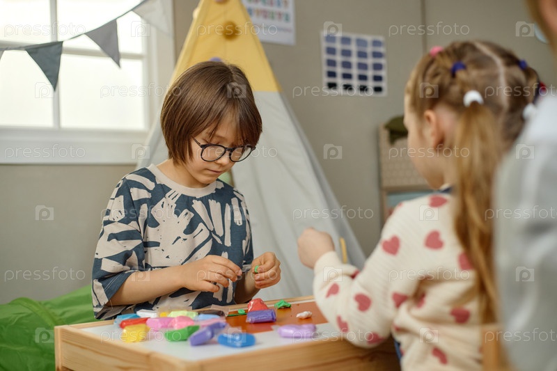 Мальчик и девочка играют с образовательными игрушками в детском саду