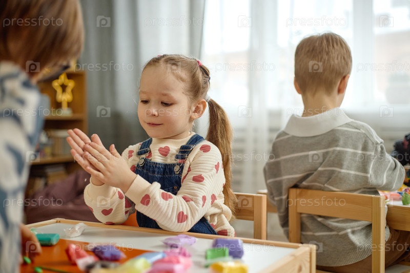 Девочка, формирующая модельную глину с детьми в классе детского сада