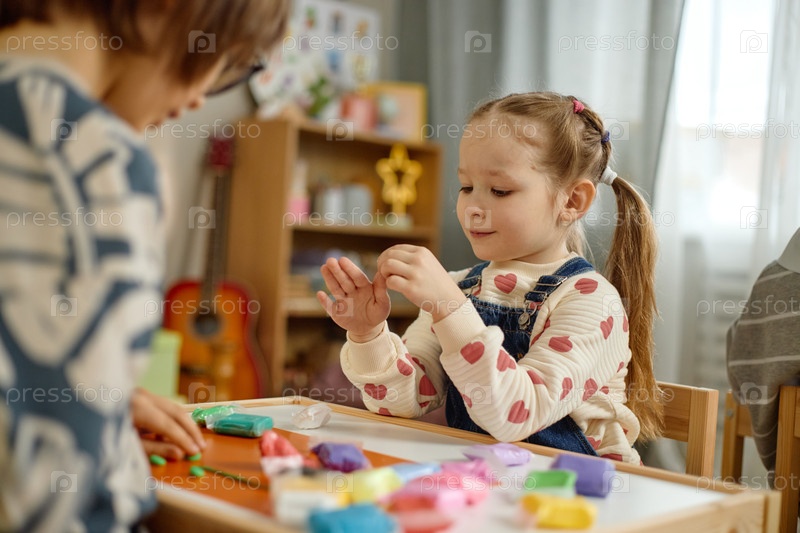 Девушка, играющая в моделирование Глина с мальчиком в классе детского сада