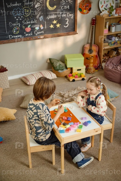 Вертикаль мальчика и девочки, строящих красочные формы во время детского сада