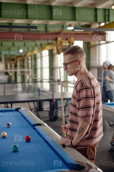 Вертикаль молодого человека, играющего в бильярд в рекреационном центре промышленного стиля