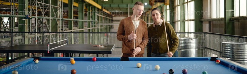 Header of Молодой человек и молодая женщина играют в бильярд в помещении