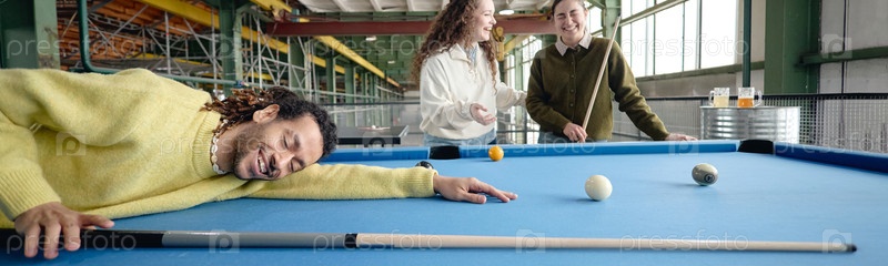 Заголовок молодых взрослых многонациональных друзей, смеющихся и играющих в бильярд внутри