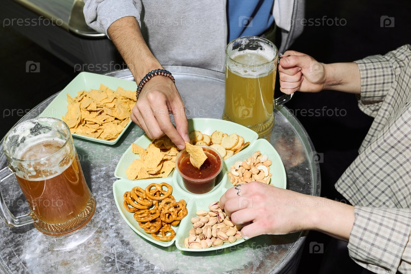 Молодой взрослый мужчина и женщина делятся пивом и закусками на общественной встрече