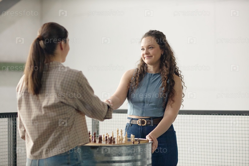 Молодые женщины пожали друг другу руки после игры в шахматы на крыше