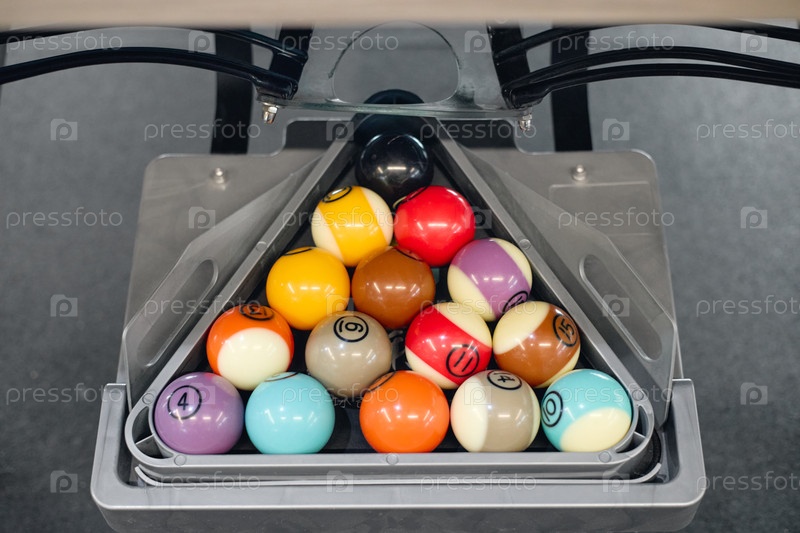 Ближайшее изображение бильярдных мячей, расположенных в треугольнике на бильярдном столе перед игрой
