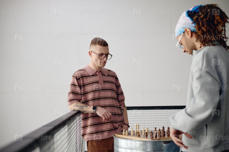 Молодой взрослый мужчина играет в шахматы с бирациальным другом-мужчиной внутри дома