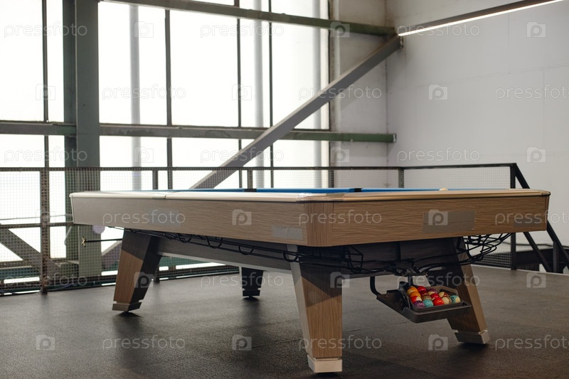 Современный бильярдный стол, стоящий пустым в солнечной промышленной комнате отдыха