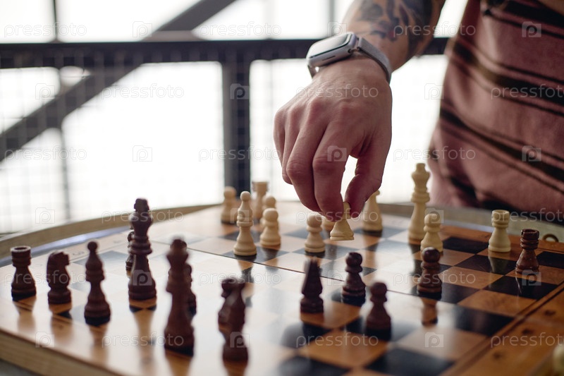 Молодой взрослый мужчина играет в шахматную игру, делая стратегический ход