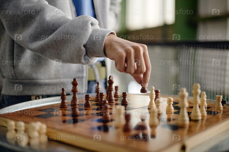 Молодой взрослый мужчина разрабатывает стратегию передвижения, играя в шахматы внутри дома