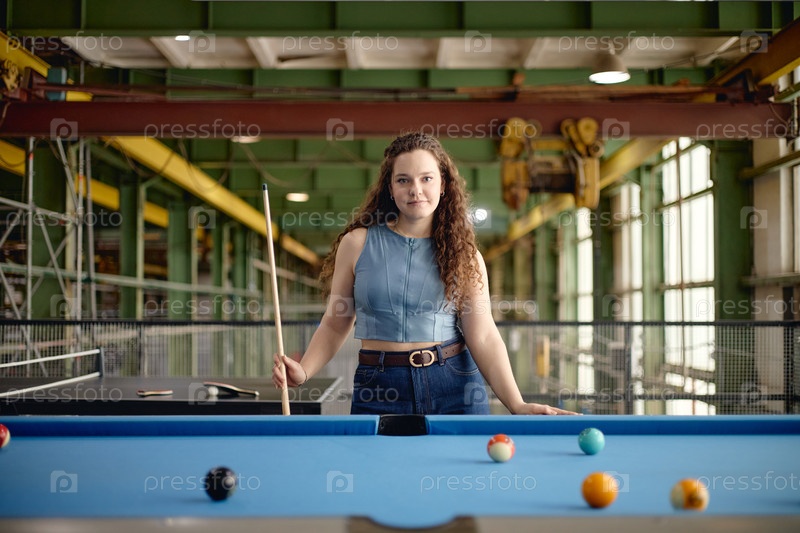 Портрет молодой взрослой женщины, играющей в бильярд в индустриальной обстановке