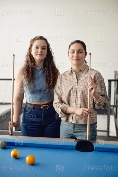 Вертикальный портрет двух молодых взрослых женщин, стоящих у бильярдного стола и держащих подсказки
