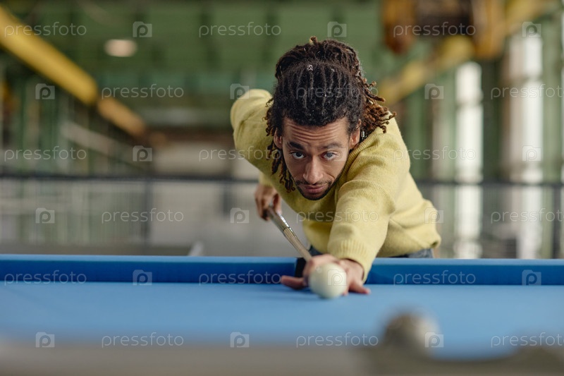 Молодой взрослый чернокожий мужчина играет в бильярд и стремится к ключевому мячу в бильярдном зале