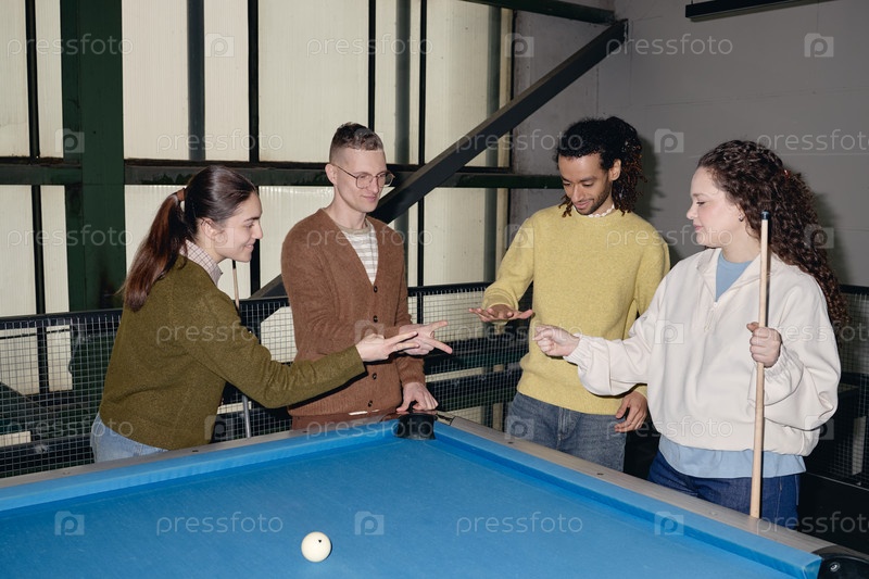 Группа молодых мультиэтнических взрослых, решивших сделать поворот перед игрой в бильярд