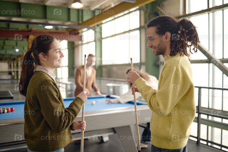 Молодая женщина и молодой чернокожий мужчина играют в бильярд и улыбаются внутри