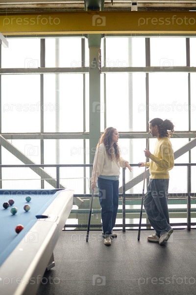 Вертикаль молодой взрослой женщины и мужчины с подсказками, разговаривающих рядом со столом бильярда