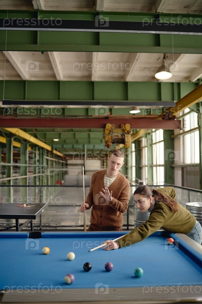 Вертикаль молодого человека и женщины, играющих в бильярд в комнате промышленного стиля