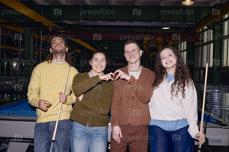 Разнообразные молодые взрослые улыбаются и жестикулируют форму сердца, играя в бильярд