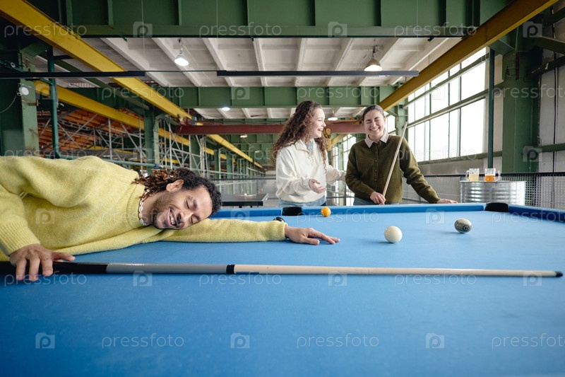Молодые взрослые многонациональные друзья смеются, играя в бильярд внутри