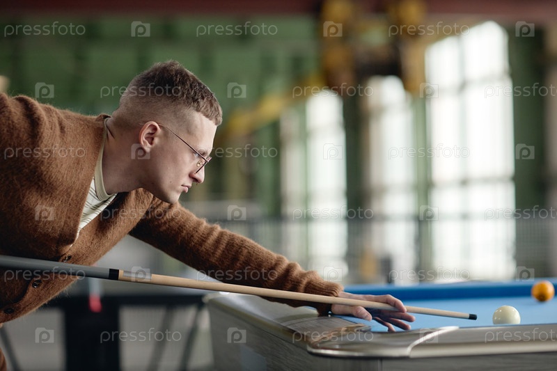 Молодой человек играет в бильярд, сосредотачиваясь на точном выстреле