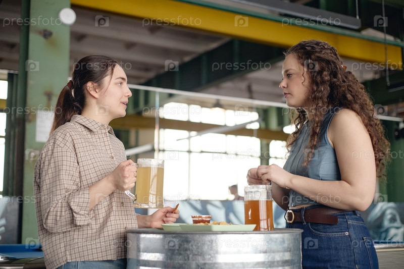 Молодые взрослые женщины общаются и пьют пиво в помещении